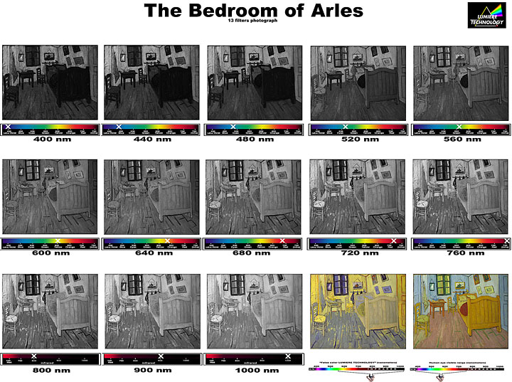 Het gaat om het schilderij "De slaapkamer van Arles" van Vincent van Gogh. De opnamen zijn gemaakt in ultraviolet (400 nanometer) tot en met infrarood (1000 nm). De laatste foto is in gewoon zichtbaar licht gemaakt en de op één na laatste is samengesteld uit de opnamen van 600 tot 1000 nm). Door foto's samen te stellen die in verschillende golflengten zijn gemaakt, kun je details weergeven die je in gewoon zichtbaar licht niet ziet.